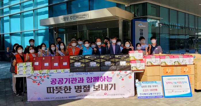 아름동지역사회보장협의체는 특화사업비 위문품을 구입하고 한국해양교통안전공단은 100만 원 상당 소고기를, 국민건강보험공단대전세종충청지역본부는 후원금 100만 원을 기부했다.