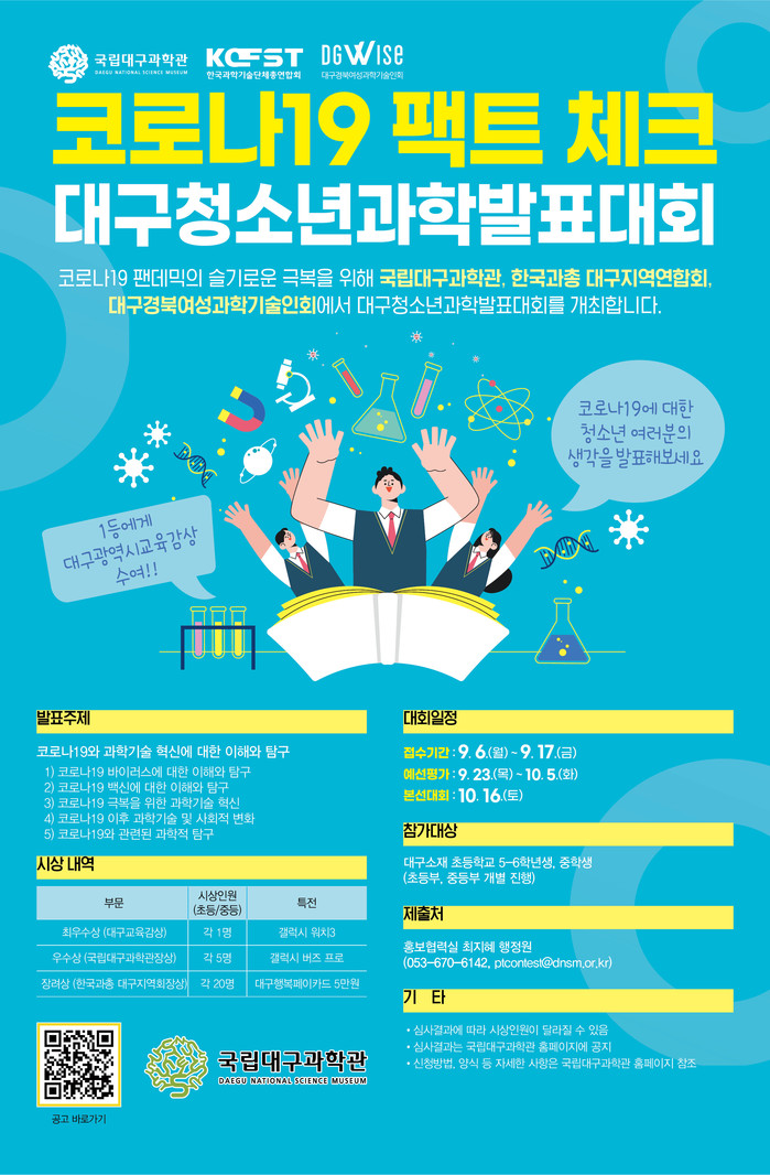 코로나19와 과학기술 혁신에 대한 청소년들의 이해 확산 및 신뢰 향상을 위해 진행되는「코로나19 팩트체크 대구청소년과학발표대회」는 9월 6일부터 17일까지 2주간 접수를 받는다.