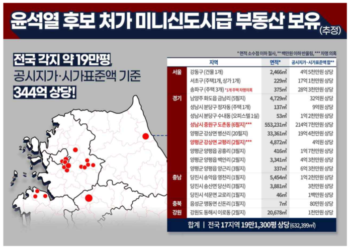 홍기원 현안대응TF 단장은 "윤 후보의 인사청문회 제출 자료 및 장모 최씨의 부동산 압류 내역을 확인한 결과 윤 후보의 처가가 보유한 부동산은 전국 17개 지역의 토지 49필지, 주택·상가 7개, 건물 1개 등 총 57개로, 면적이 19만1,300평(632,299㎡)에 달한다"면서 "공시지가 및 시가표준액으로만 합해도 약 340억원2,000만원"이라고 밝혔다.