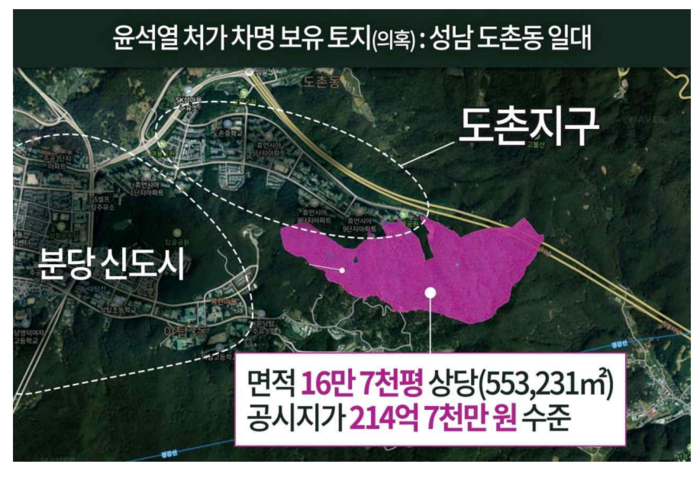 특히 "경기도 성남시 도촌동 일대 16만여 평은 토지를 취득하는 과정에서 사문서를 위조하고, 부동산실명법을 위반했다는 혐의로 장모 최씨가 기소돼 현재 재판을 받고 있다"며 "해당 도촌동 토지는 상당 부분이 자연녹지지역으로 지정돼 있지만 인접한 대규모 주거단지로 인해 개발 기대가 높아 공시지가만 해도 총 214억7,000만원에 달하는 것으로 확인됐다"고 했다.