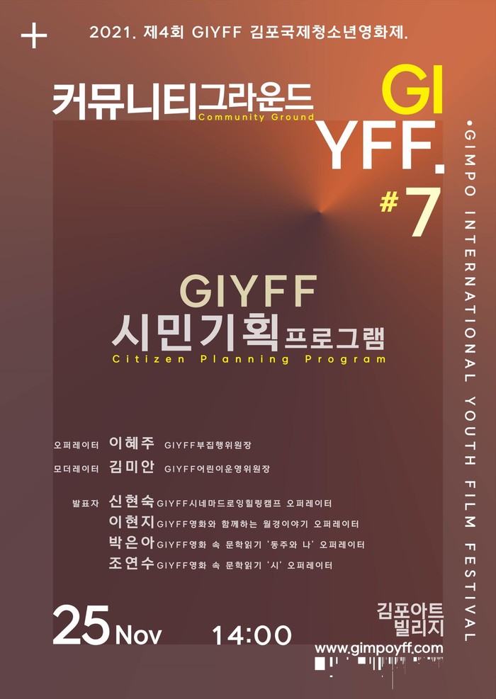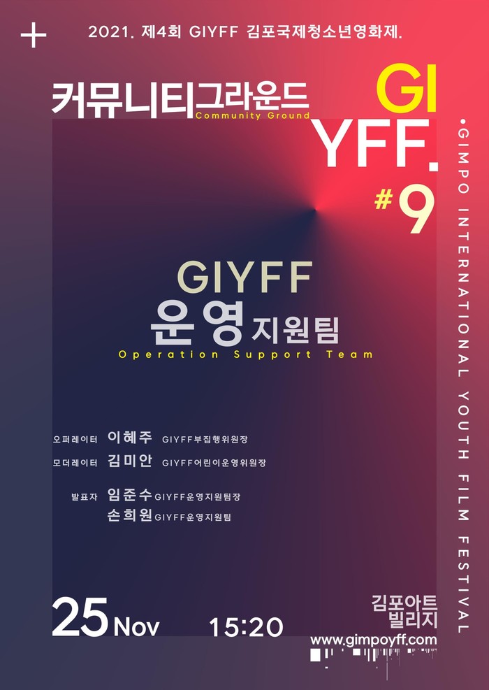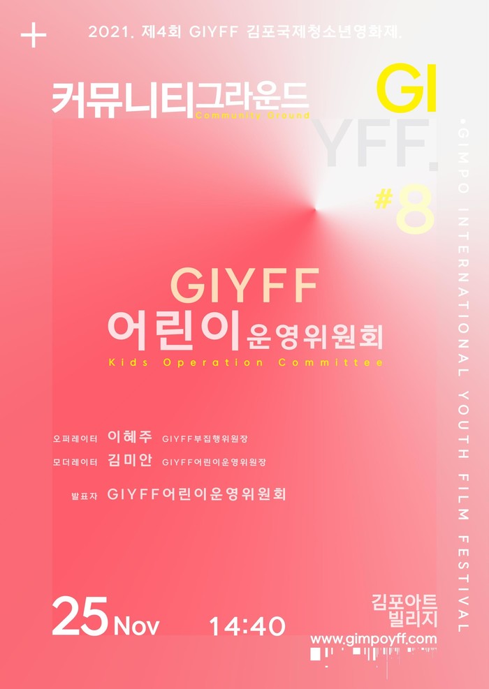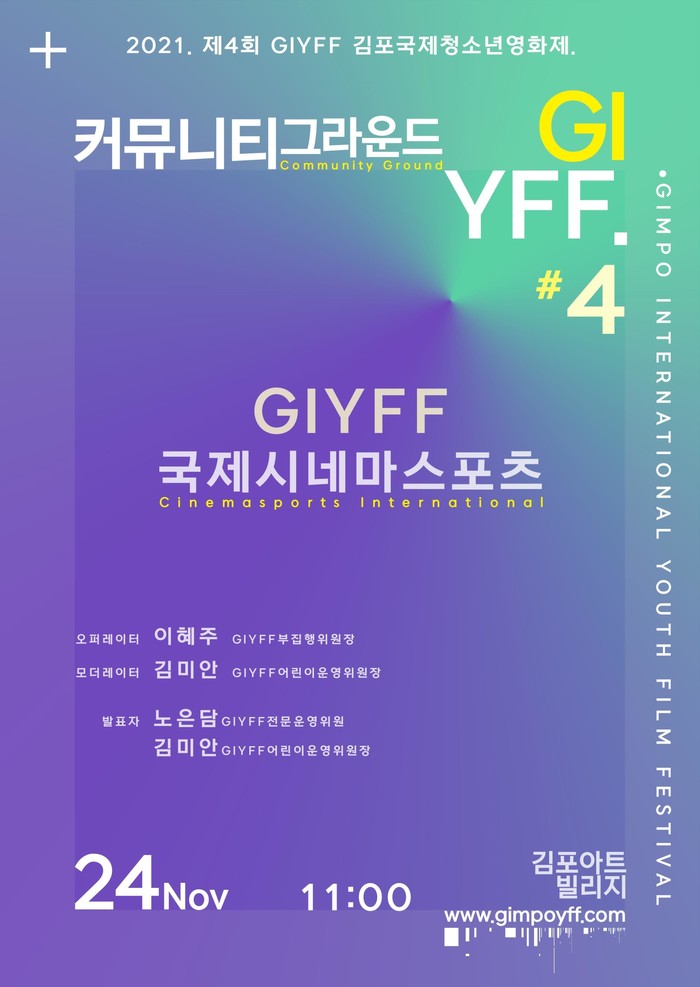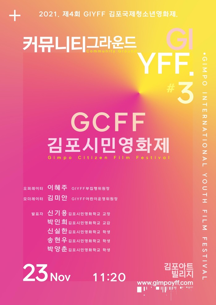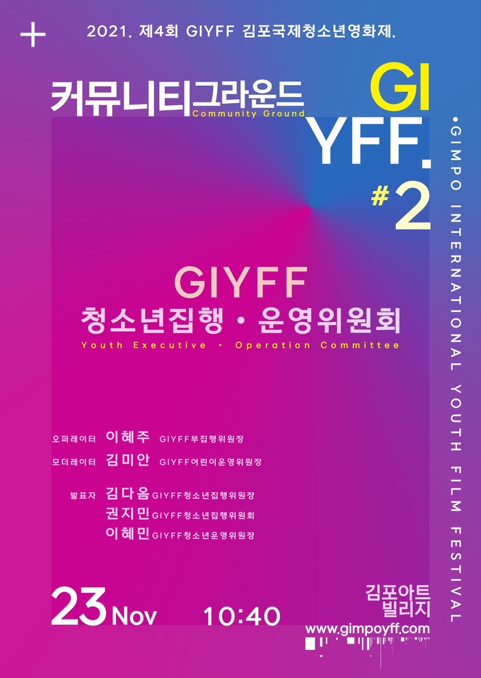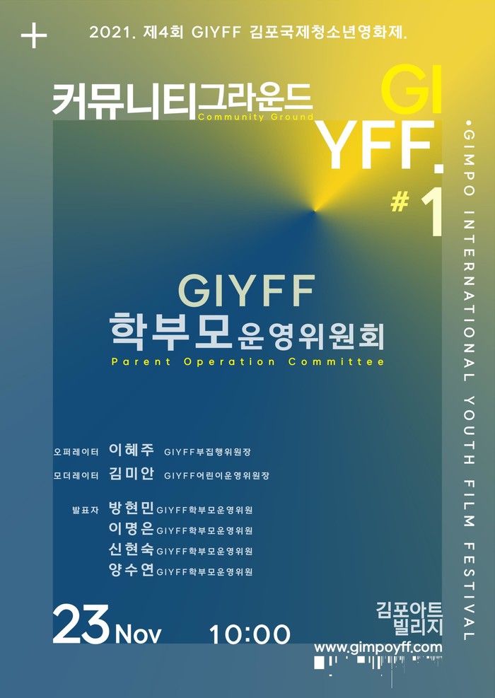 이밖에 ‘영화전문가와 함께 배우는 영화 읽기의 기본: GIYFF 시네마리터러시캠프(11/21)’, ‘국내수상작 감독과의 대화(11/21)’, ‘해외수상작 감독과의 대화(11/22)’, ‘GIYFF커뮤니티 그라운드: GIYFF를 만드는 시민들(총 5회)’, ‘GIYFF with France, 영화로 만나는 환상의 미술교육(11/21)’ 등 어린이 청소년을 위한 다양한 행사가 기다리고 있다.