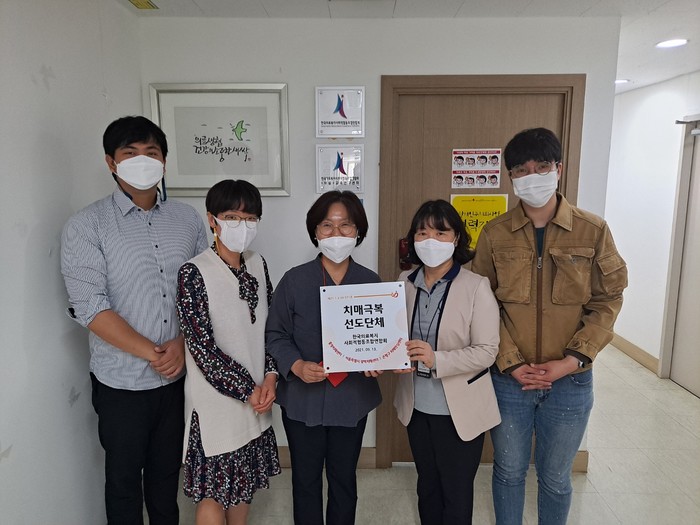 | ▲ 은평구 치매극복선도단체 지정(좌측에서 세 번째) 민앵 한국의료복지 사회적협동조합 상임이사, (우측에서 두 번째) 조경희 치매안심센터 총괄팀장 |