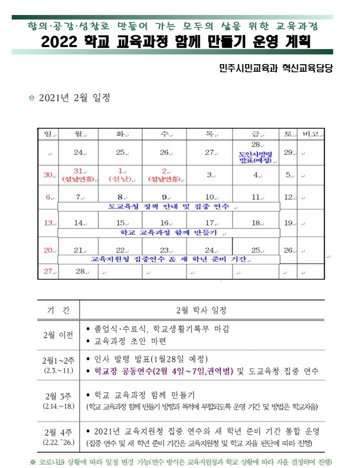 「학교 교육과정 함께 만들기」는 △함께 만들어가는 학교 교육과정(합의), △함께 고민하고 해결하는 교내자율장학(공감), △함께 되돌아보는 학교평가(성찰)로 순환하며 기간 이후에도 연중 운영된다.
