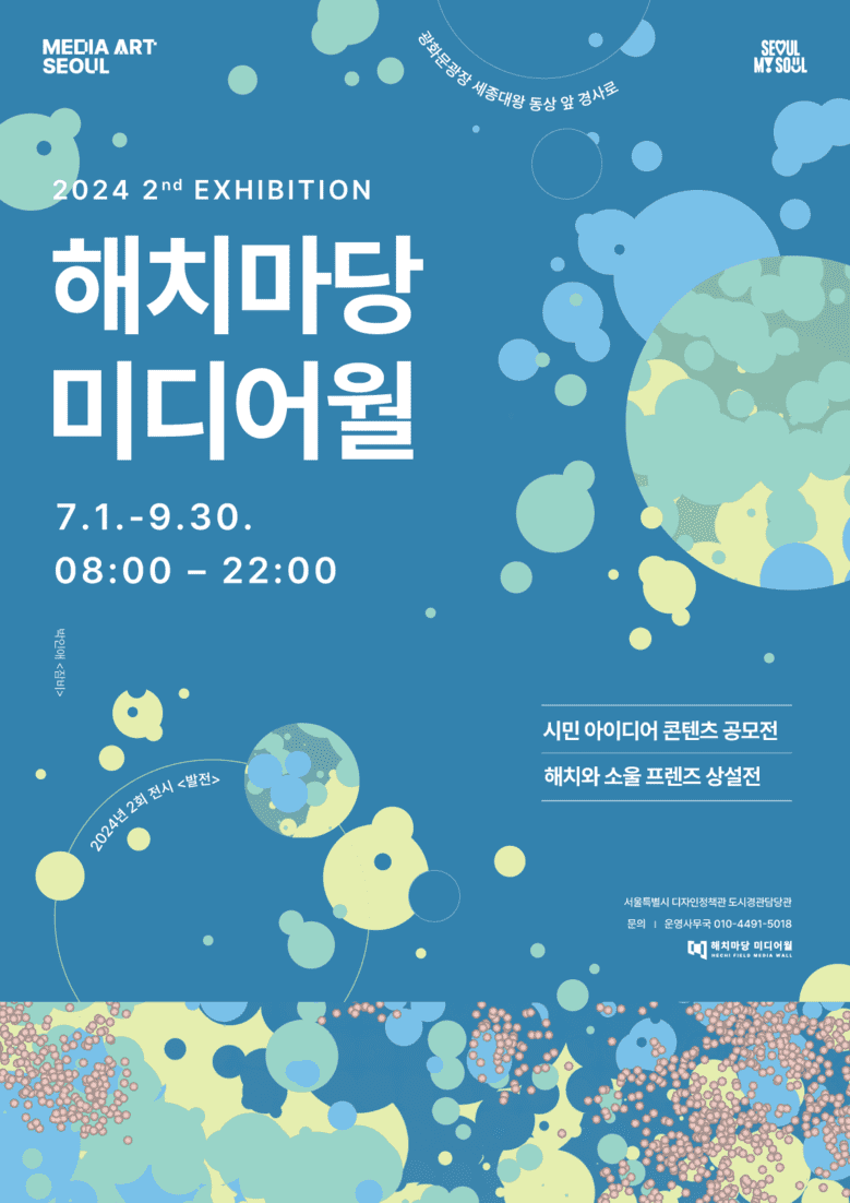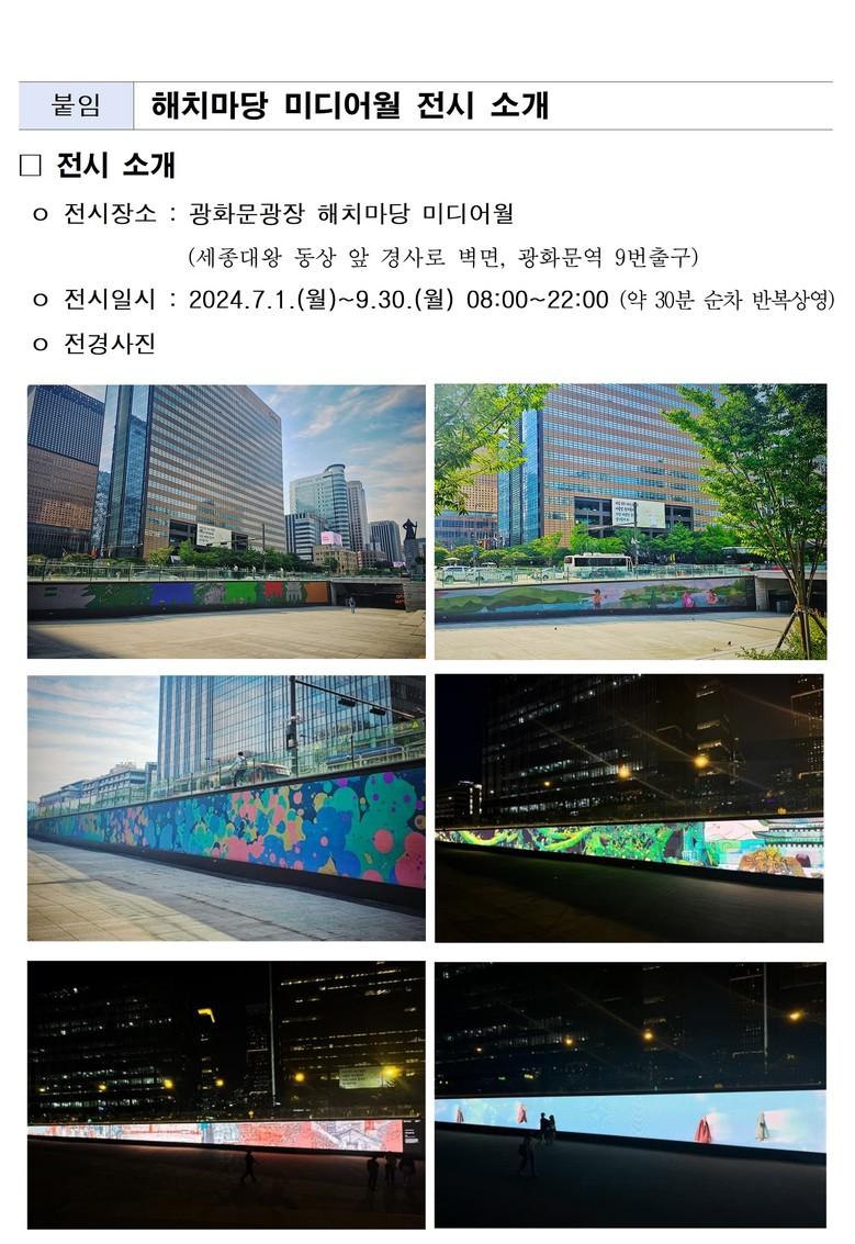 서울시는 광화문광장 해치마당 미디어월에서 시민 아이디어 콘텐츠 공모전과 해치와 소울 프렌즈 상설전으로 구성된 2024년 두 번째 미디어아트 전시를 개최한다고 밝혔다. 7.1.(월)~9.30.(월) 3개월간 매일 08~22시 관람할 수 있다.