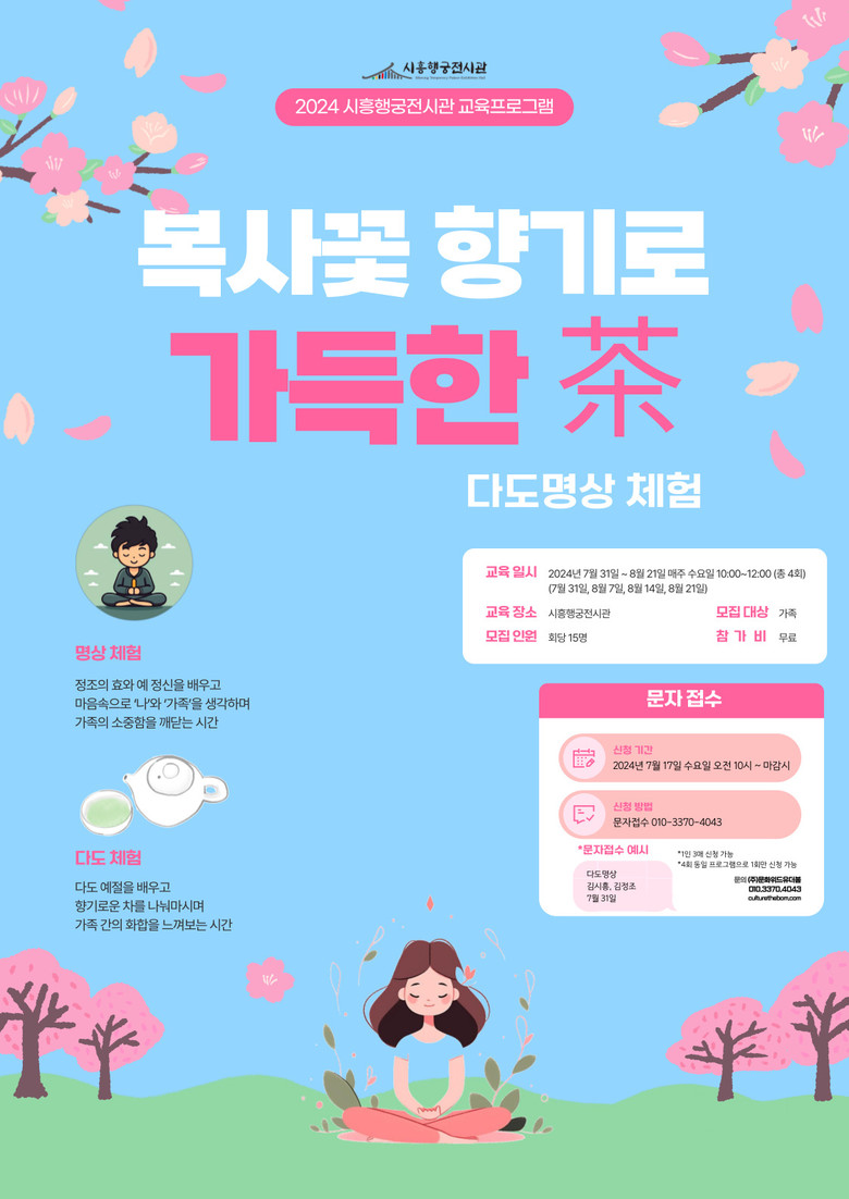 참여 희망자는 문자로 <규방공예, 이름, 회차(날짜)> 또는 <다도명상, 이름, 회차(날짜)>로 신청하면 된다.