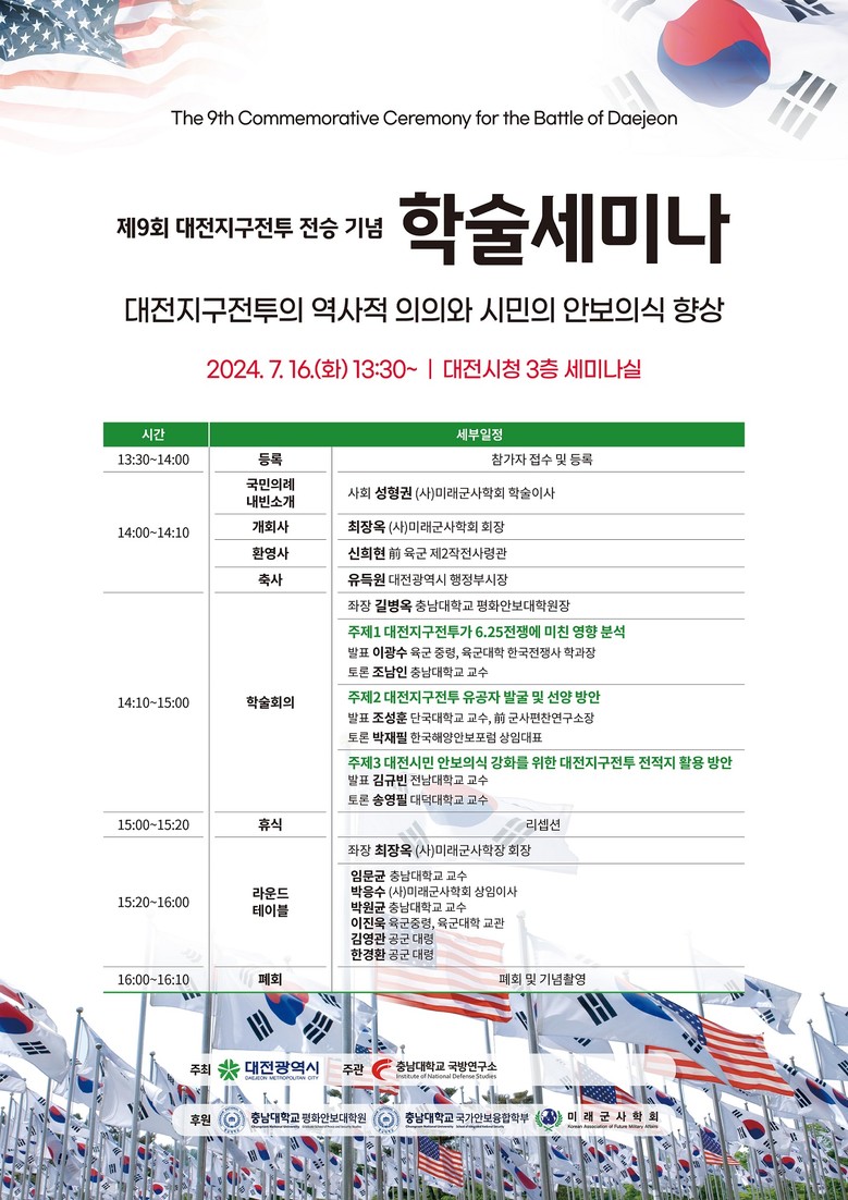 세미나 1부 학술회의에서는 대전지구전투가 6.25 전쟁에 미친 영향 분석, 대전지구전투 유공자 발굴 및 선양 방안, 대전시민 안보의식 강화를 위한 대전지구전투 전적지 활용 방안에 대한 주제 발표가 진행됐고 2부에선 각 발제에 대한 집단 토론이 이어졌다.