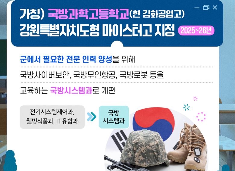 지난해 강원형 마이스터고에 지정된 김화공업고(철원)는 금년도 교육부 재구조화 사업에도 선정되어 한국국방과학고 전환에 더욱 탄력을 받을 전망이다. 기존 모든 학과를 △국방시스템과(3학급)로 개편하고, 국방사이버보안, 국방무인항공, 국방로봇 분야 기술인재를 양성할 계획이다. 앞으로 약 10억의 예산을 확보한 만큼 국방 관련 첨단실습실 구축에 투입할 예정이다.