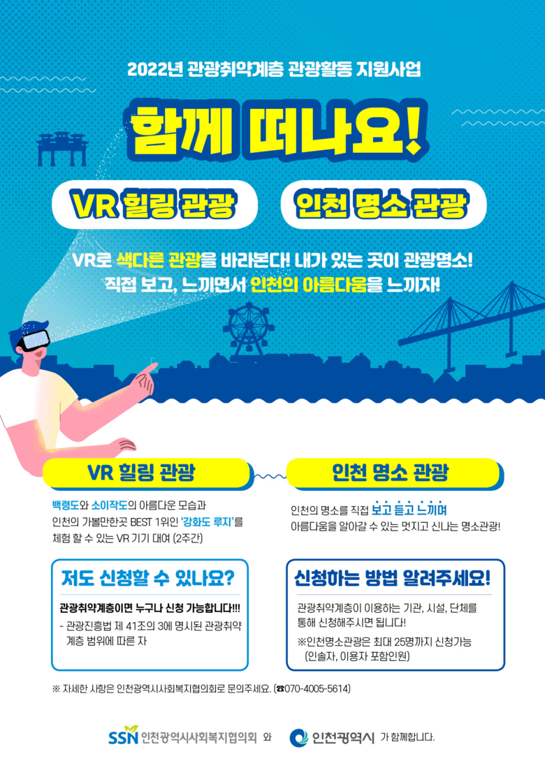 홍준호 시 문화관광국장은 “코로나19로 개별 관광이 더욱 어려웠던 장애인, 저소득층 등 취약계층의 관광 기회를 확대하고 참여자들이 불편함 없이 인천을 보고 즐길 수 있도록 세심하게 준비하겠다”고 말했다.