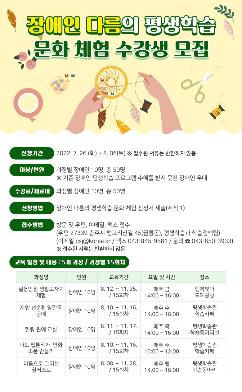 ‘다름의 평생학습’에 참여를 원하는 장애인들은 충주시평생학습관 홈페이지(https://goodedu.chungju.go.kr/) 공지사항에 있는 참가 신청서를 우편, 메일, 팩스로 오는 8월 6일(토)까지 제출하면 된다.
