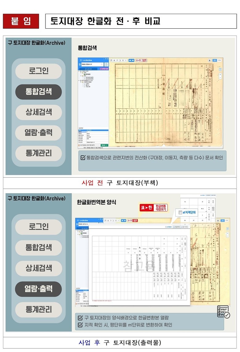 지난 4년간 구축한 옛 토지대장 한글화·전산화는 일제강점기 작성된 313만 6000장의 토지대장을 한글로 변환·디지털화해 기록물 노후화·훼손 문제를 해소하고 한자 및 일본식 표기로 인한 도민 불편을 개선하는 데 중점을 뒀다.
