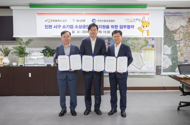 이날 협약식은 강범석 서구청장을 비롯해 전병권 하나은행 경인영업본부 지역대표, 전무수 인천신용보증재단 이사장이 참석한 가운데 진행됐다.