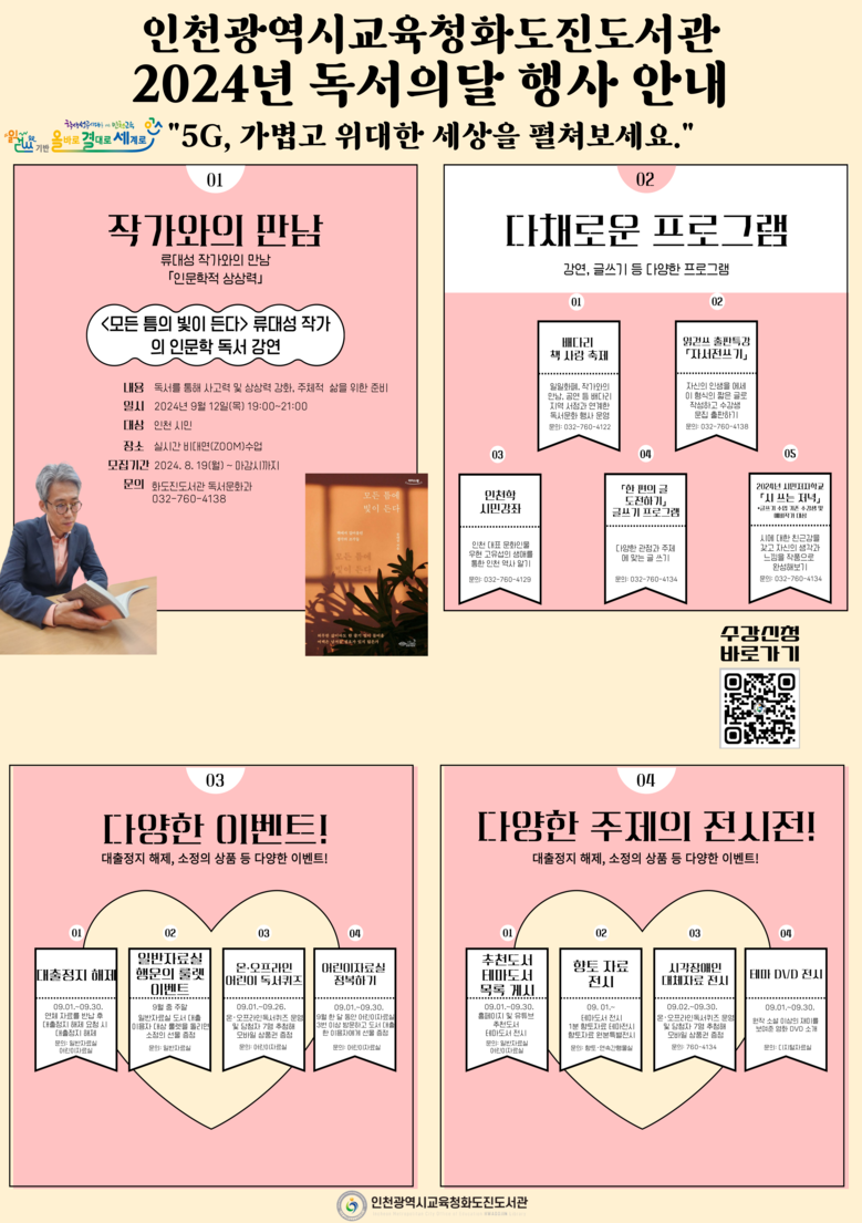 독서의 달 행사는 지역 주민 누구나 무료로 참가할 수 있으며, 세부 사항은 화도진도서관 누리집(https://lib.ice.go.kr/hwadojin)을 참고하면 된다.