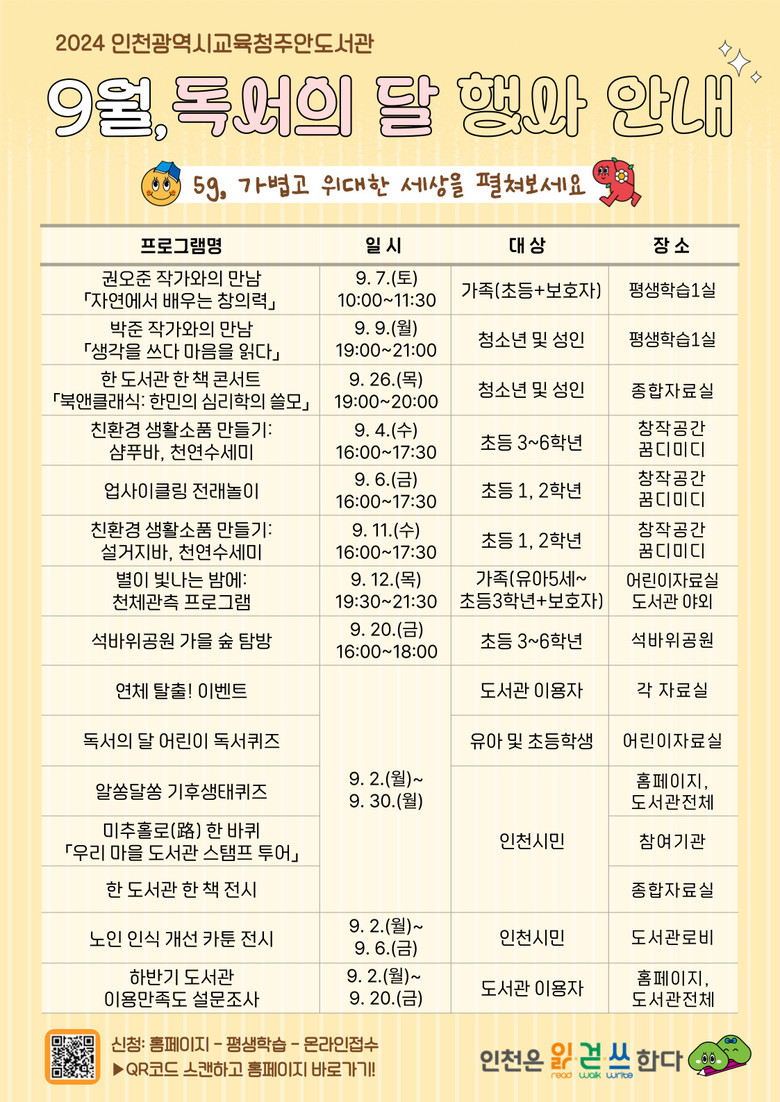 주안도서관은 9월 독서의 달 기념 주요 행사로 ▶9월 7일 권오준 작가의 ‘자연에서 배우는 창의력’ ▶9월 9일 박준 시인의 ‘생각을 쓰다 마음을 읽다’ ▶9월 26일 ‘북앤클래식: 한민의 심리학의 쓸모’ 음악과 함께하는 북 콘서트를 운영한다.