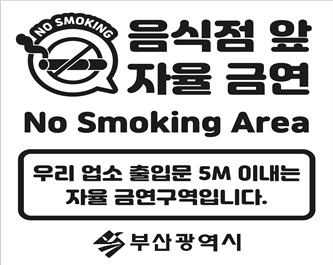 부산시는 음식업소 출입문 앞 5m 이내를 자율 금연구역으로 지정해 비흡연자의 간접흡연 피해를 줄이고 지역사회 금연 분위기를 확산한다는 방침이다.