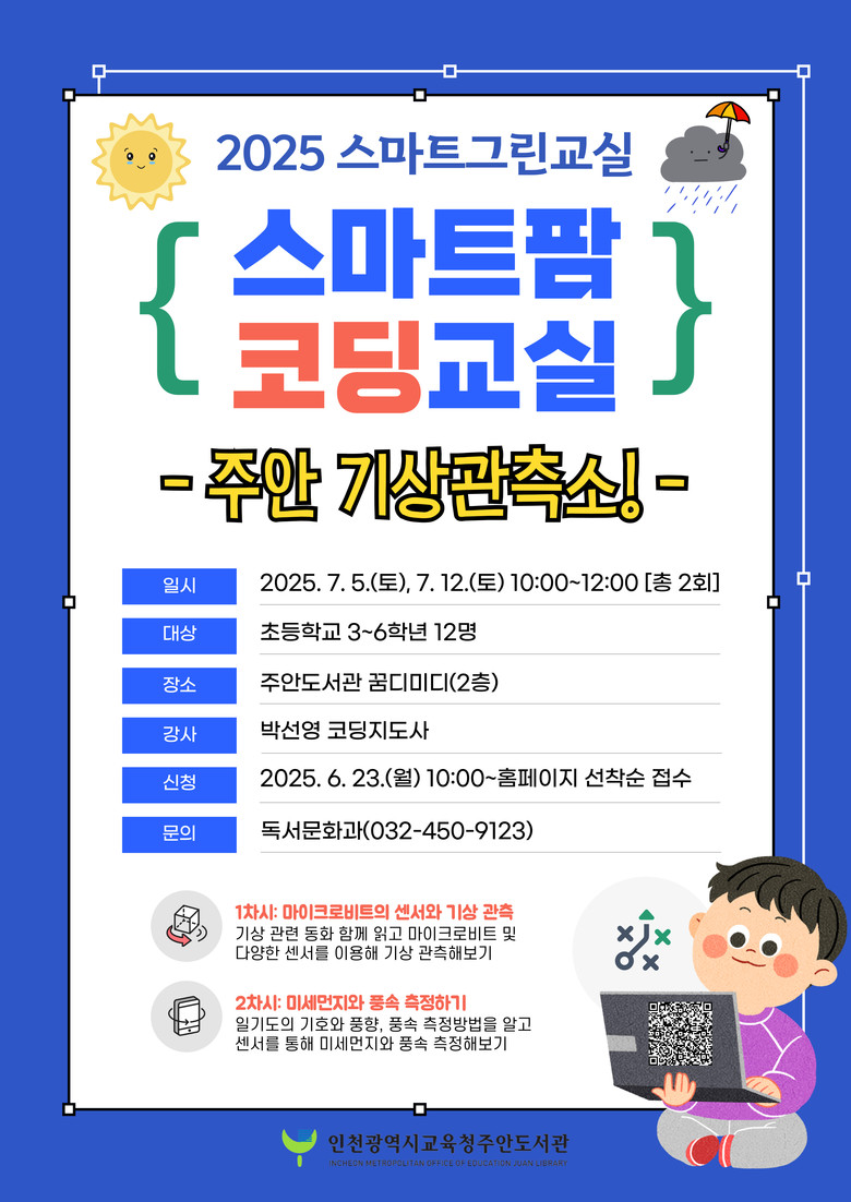 이번 프로그램은 스마트팜의 원리를 바탕으로 기상관측과 기후환경 이해를 돕는 코딩 수업으로, 주안도서관 2층 꿈디미디에서 오전 10시부터 2시간 동안 진행된다.