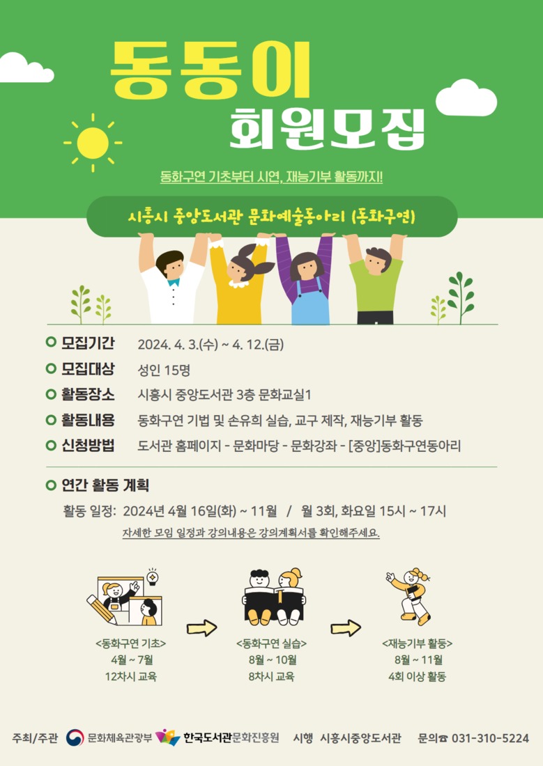 동화구연 동아리(동동이)에 참여를 희망하는 시민은 시흥시 도서관 누리집(http://lib.siheung.go.kr)을 통해 신청할 수 있으며, 자세한 내용 및 기타 문의 사항은 누리집 공지 사항을 확인하거나 중앙도서관(031-310-5224)으로 문의하면 된다.