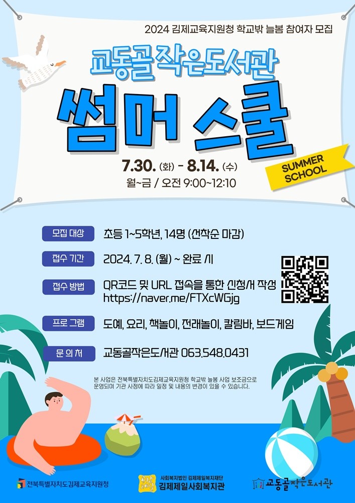 [김제 = 세계타임즈 김서주 기자] 김제시(시장 정성주)는 교동 골 작은 도서관(관장 안정한)이 김제교육지원 청 학교 밖 늘봄 공모사업에 선정돼 여름방학 특별 프로그램으로 ‘교동 골 작은 도서관 썸 머 스쿨’을 운영한다고 밝혔다.