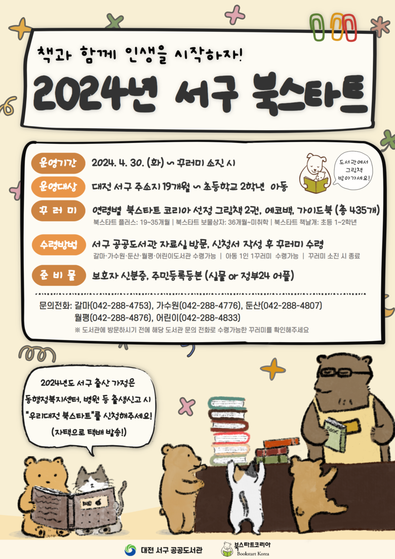 책 꾸러미는 연령 단계별 그림책 2권, 북스타트 가이드북, 에코백으로 구성돼 있으며, 신청·배부는 19개월~초등학교 1·2학년 아동을 대상으로 오는 4월 30일부터 갈마·가수원·둔산·월평·어린이도서관에서 선착순으로 이뤄진다.