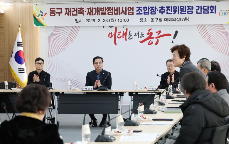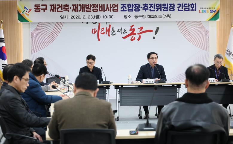 이날 간담회에는 박희조 동구청장을 비롯해 재건축·재개발 정비사업 조합장과 추진위원장 등 관계자들이 참석했으며, ▲도시 및 주거환경정비법 개정사항 등 주요 정책 공유 ▲구역별 사업 추진 동향 점검 ▲실무 건의사항 및 애로사항 청취 순으로 진행됐다.
