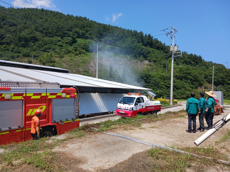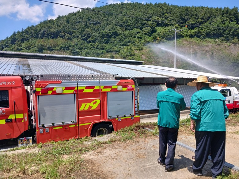 9일 오후 경남도 농정국장과 남해군 관계자 등은 축산농가를 직접 찾아 소방차와 가축방역 소독차량을 동원하여 더위에 지친 젖소 농장 지붕에 물을 뿌려 열기를 식히고, 가축 피해 최소화를 위해 적극 대응했다.