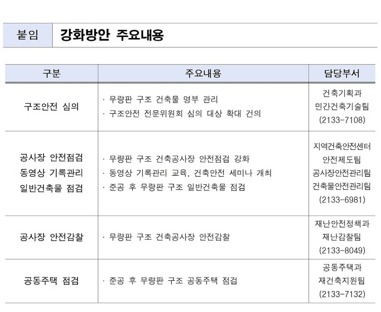 동영상 기록관리 대상을 확대(2023.7월)하고, ‘구조안전 전문위원회 심의 및 운영기준’을 신설(2024.7월)하여 공사 중 설계가 변경된 경우 전문위원회에서 다시 안전성을 확인하도록 관리하는 등 다각도의 대책을 추진해 왔다.