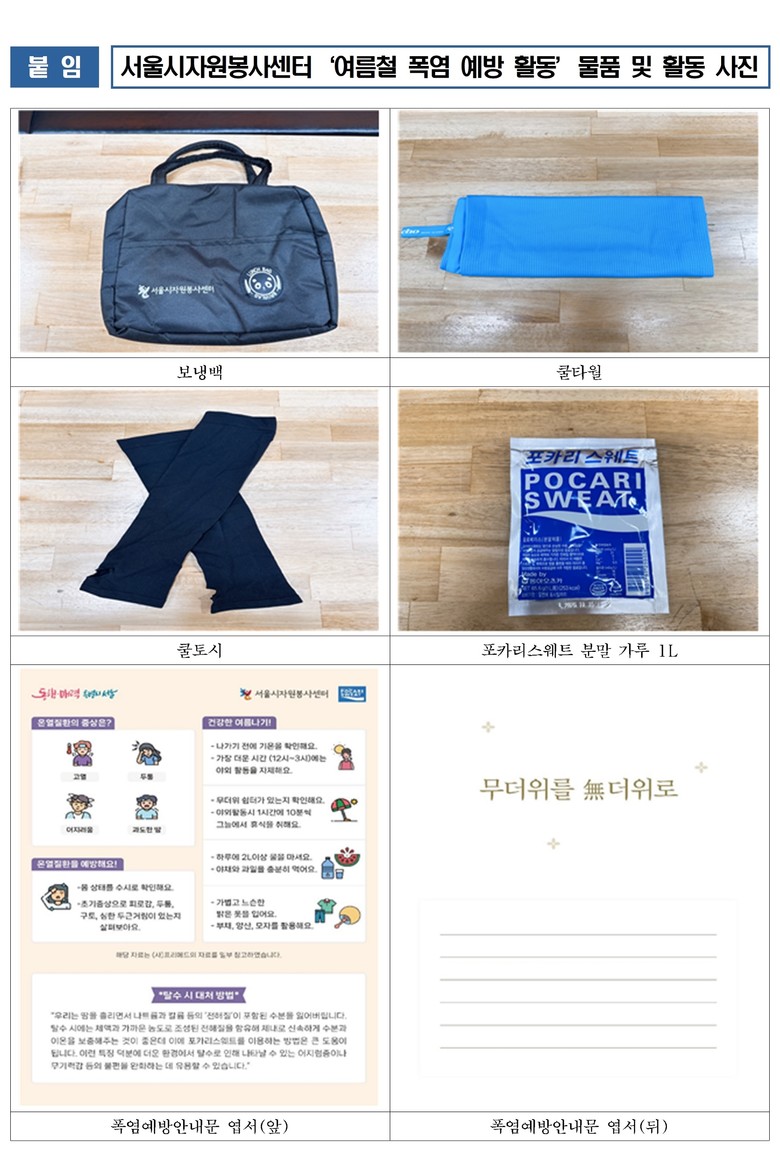 서울시자원봉사센터는 폭염 예방을 위해 휴대용 쿨타월, 쿨토시, 포카리스웨트 분말 가루, 편지가 작성된 폭염 예방 안내문 엽서를 보냉백에 담아 자원봉사자에게 활동 키트로 제공하며, 자원봉사자 1,000여 명이 폐지 수집 어르신에게 직접 전달과 함께 안부 묻기 활동을 진행할 예정이다.