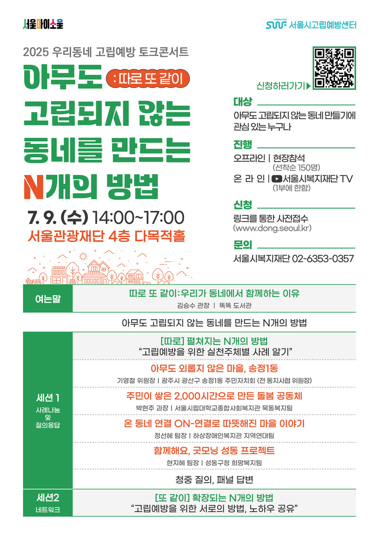 <아무도 고립되지 않는 동네를 만드는 N개의 방법>을 주제로 열리는 이번 토크콘서트는 현장 참가자 120명과 함께 재단 유튜브 채널(서울시복지재단TV/www.youtube.com/welfareseoul1)로 생중계되어 사회적 고립에 관심 있는 시민이면 누구나 시청할 수 있다.