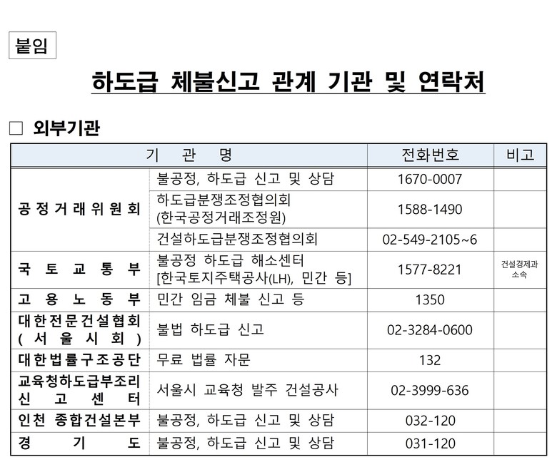 이 외에도 시는 1월 29일(목)부터 2월 13일(금)까지 12일간 ‘하도급 대금 체불 집중 신고 기간’을 운영한다. 신고는 서울시 하도급부조리신고센터(☎ 02-2133-3600)로 하면 되고 다수·반복 민원 발생 현장에는 현장기동점검을 추가로 실시할 예정이다.