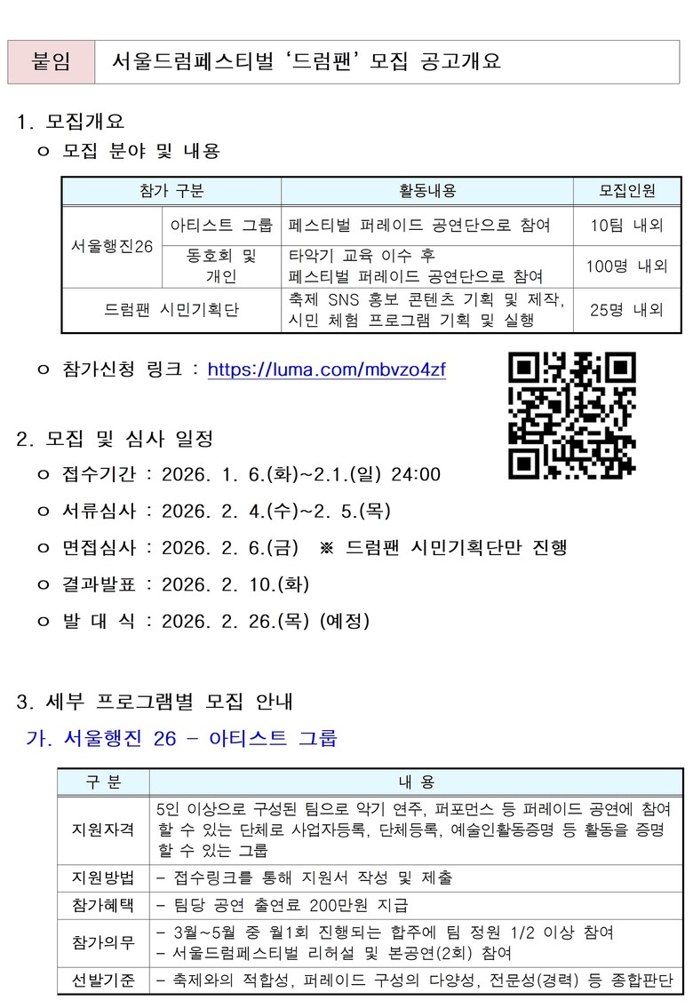 이번 ‘드럼팬’ 모집에서 가장 눈길을 끄는 프로그램인 ‘서울행진26’은 직접 타악기 연주에 참여할 시민공연단으로, 아티스트 그룹과 일반 시민(동호회 및 개인)으로 나누어 모집한다.