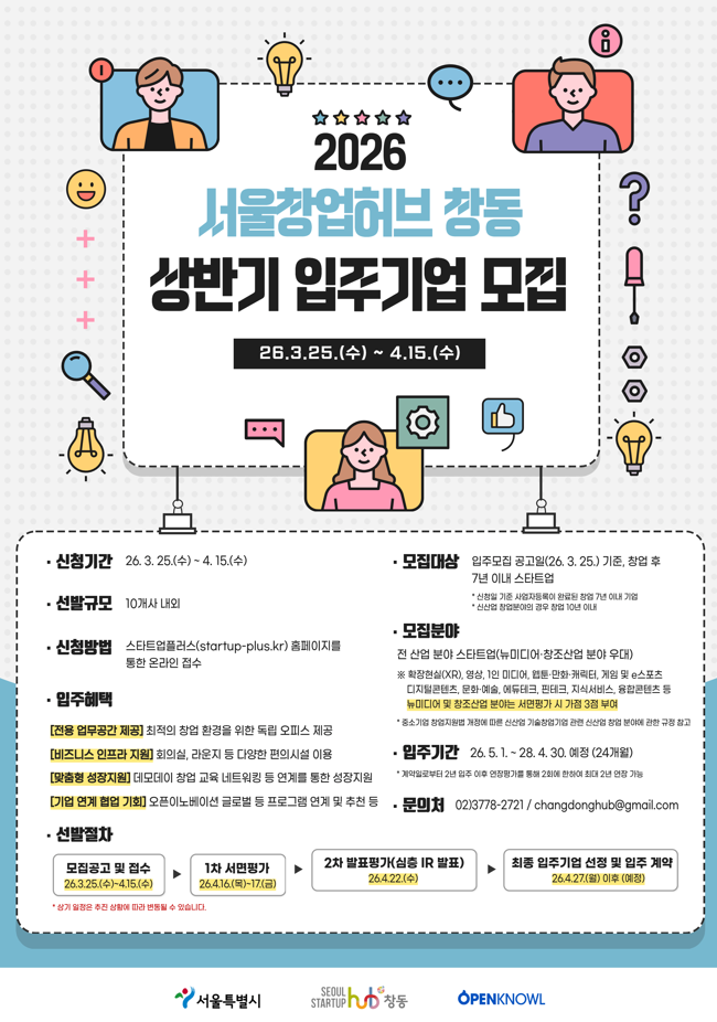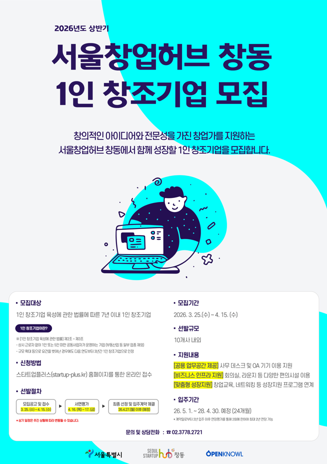 서울시는 ‘서울창업허브 창동’에 입주할 창업 7년 이내 스타트업 20개사(입주기업 10개사, 멤버십기업 10개사)를 오는 4월 15일(수)까지 모집한다. XR, 영상, 1인 미디어, 웹툰·만화·캐릭터, 게임 및 e스포츠 등 뉴미디어 및 창조산업 전반의 혁신기술을 보유한 기업이면 신청할 수 있다.