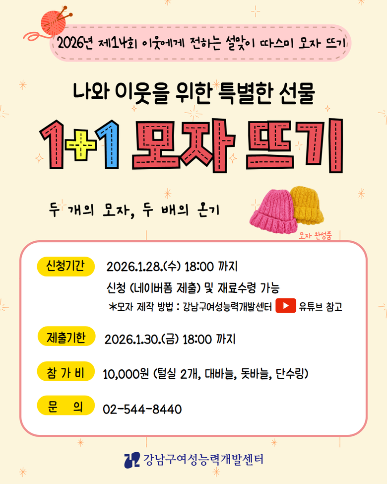 이 행사는 강남구여성능력개발센터 학습동아리 회원들이 2013년 자발적으로 시작해 올해로 14회째를 맞는다. 지난해에는 241개의 모자를 취약계층에게 선물했다. 참가를 신청하면 두 개의 실로 하나는 소외된 이웃을 위한 선물을, 다른 하나는 자신을 위한 모자를 제작하여 이웃에게 따뜻한 온정을 나누는 소중한 시간을 보낼 수 있다.