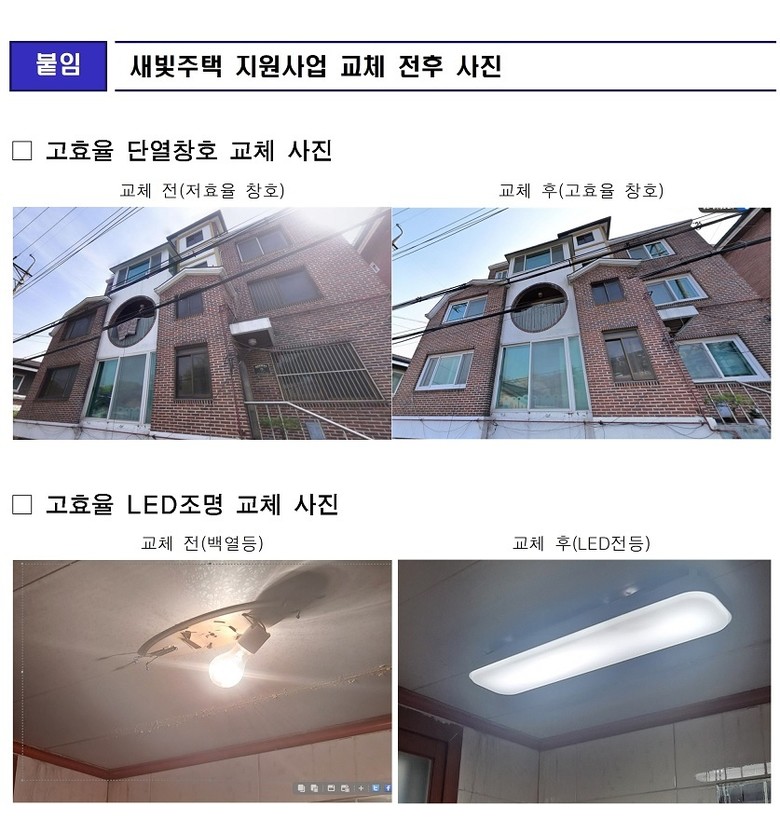 - 단열 창호 및 고효율 LED 조명 교체 비용 70% 이내, 최대 5백만 원까지 지원