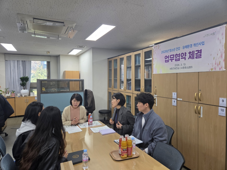 [서초구 세계타임즈=이장성 기자] 서울 서초구(구청장 전성수)는 13일 보건소와 서초유스센터와의 업무협약을 통해 청소년이 스스로 건강‧유해환경을 찾아 개선하는 참여형 사업을 추진한다고 밝혔다.