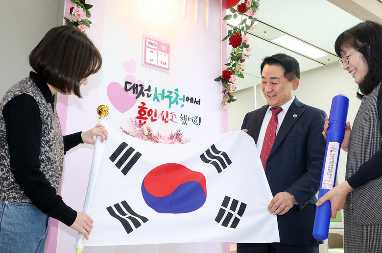 [서구 세계타임즈=이채봉 기자] 대전 서구는 혼인신고를 위해 구청을 방문한 국제결혼 부부에게 태극기를 증정한다고 20일 밝혔다.