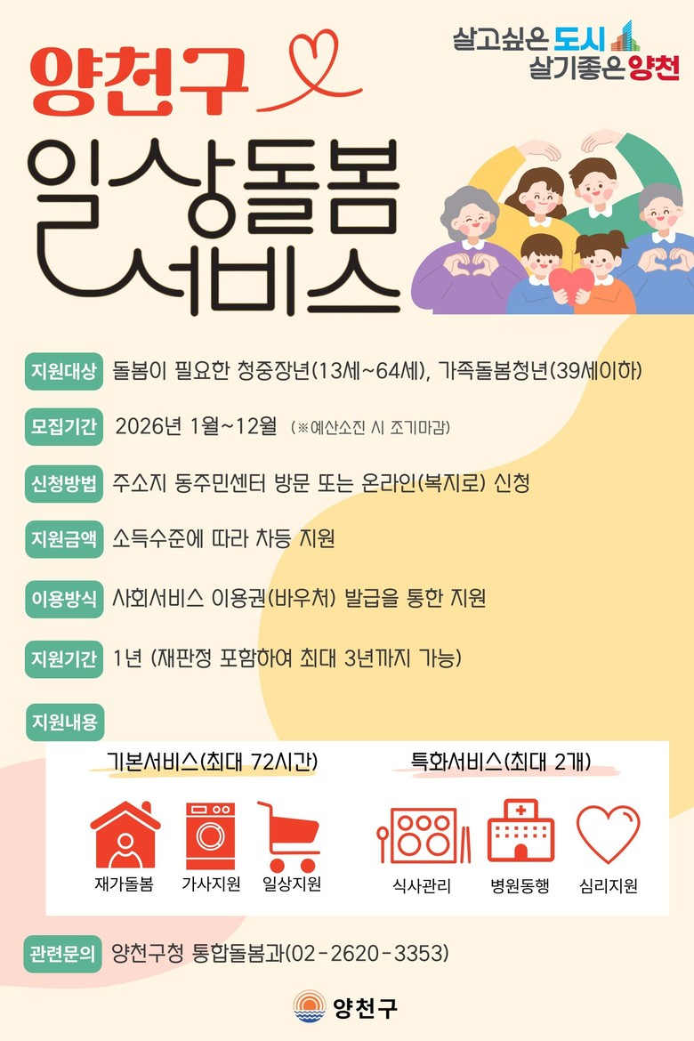 [양천구 세계타임즈=이장성 기자] 양천구(구청장 이기재)는 일상생활에 어려움을 겪는 청·중장년과 가족돌봄청년을 더욱 두텁게 지원하기 위해 2026년부터 ‘일상돌봄 서비스’를 확대 시행한다고 10일 밝혔다.