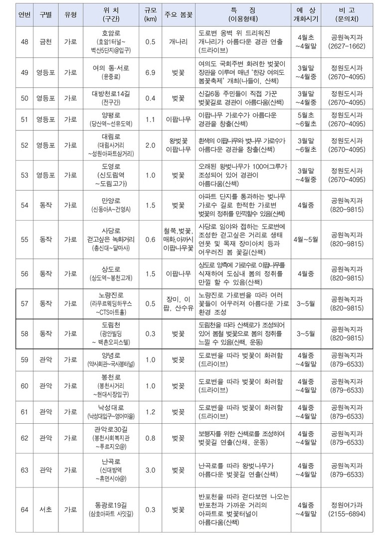서울의 봄 꽃길 홈페이지에서는 ‘우리동네 봄꽃길 찾아가기’와 함께 4개 테마별, 자치구별로 안내하고 있다.