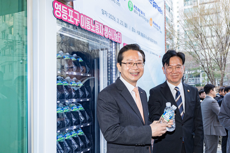 | ▲ 영등포구 이동노동자 쉼터 1호점 앞에 설치된 생수 자판기 앞에서 김영훈 고용노동부 장관과 사진 찍고 있는 최호권 영등포구청장 |