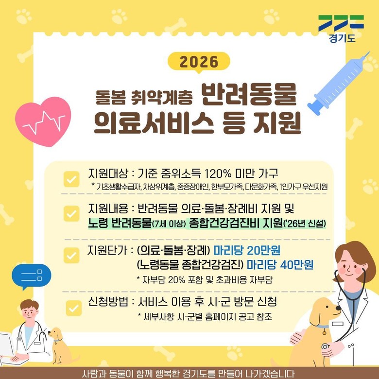 변희정 경기도 반려동물과장은 “취약계층의 외로움을 덜어줄 수 있는 반려동물이 더 오래 건강하게 곁을 지킬 수 있도록 지원 규모도 확대하고 노령 동물 종합건강검진 지원도 신설했다”며 “경기도는 사람과 동물이 서로의 온기를 나누며 끝까지 함께 걸어갈 수 있는 따뜻한 반려 문화를 만들어 가겠다”고 말했다.