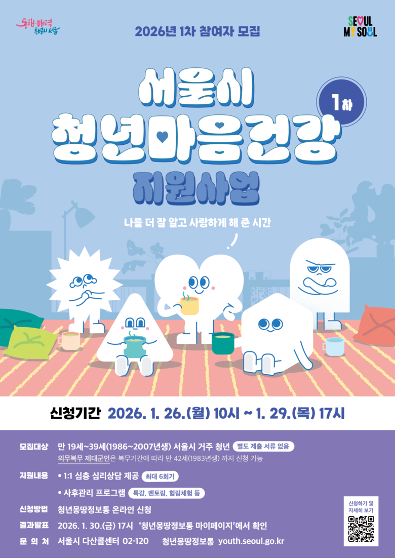 업그레이드된 ‘2026년 서울 청년 마음건강 지원사업’ 참여자 모집은 오는 26일 1차 2,500명을 시작으로 총 4회에 걸쳐 진행된다. 1차 신청 기간은 1월 26일(월) 오전 10시부터 29일(목) 17시까지다. 우울, 불안 등 정서적으로 어려움을 겪고 있는 서울 거주 19~39세 청년이면 누구나 청년몽땅정보통(youth.seoul.go.kr)에서 신청할 수 있다.