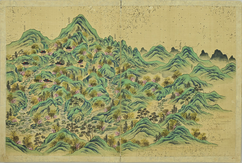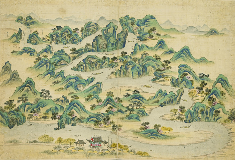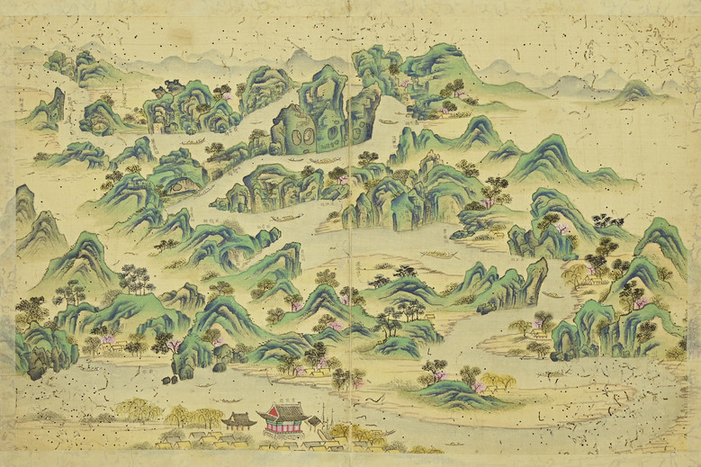 서울역사박물관 소장 <관서명승도첩>은 작자미상의 19세기 실경산수화로, 평안도의 명승을 중심으로 주변 경관을 담은 총 16면의 화첩이다. 비단에 청록 채색으로 그려진 그림은 평안도 영변, 평양, 강동, 성천, 삼등, 은산, 안주, 강계, 의주를 대표하는 명소가 담겨있다. 총 9개 고을, 14개 명승을 지역에 따라 한 폭 또는 여러 폭으로 나눠 그렸다. <관서명승도첩>은 2003년에 서울특별시 유형문화재 제177호로 지정되었다.