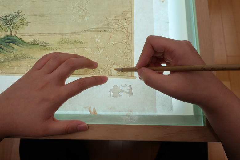 <관서명승도첩>은 비단의 훼손이 심한 상태였다. 비단의 결실부 보강을 위해 재질, 조직 그리고 열화 정도가 동일한 비단을 사용한다.(사진 10 참조). 비단의 열화 정도가 다르면 유물의 비단과 복원용 비단이 상호 동화되지 않아 수축 팽창으로 인해 뒤틀리거나 기존 비단을 훼손할 수 있기 때문이다.
