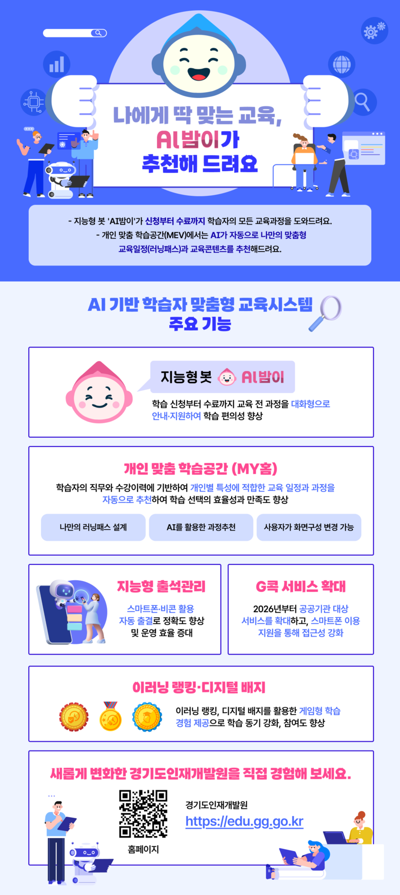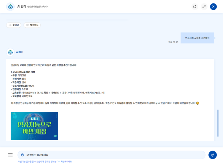 또한 학습자는 지능형 봇 ‘AI밤이’를 통해 시간과 장소에 구애받지 않고 교육과정 안내와 교육 신청·이수, 과목 추천 등 교육 운영 전반에 관한 사항을 안내받을 수 있다.
