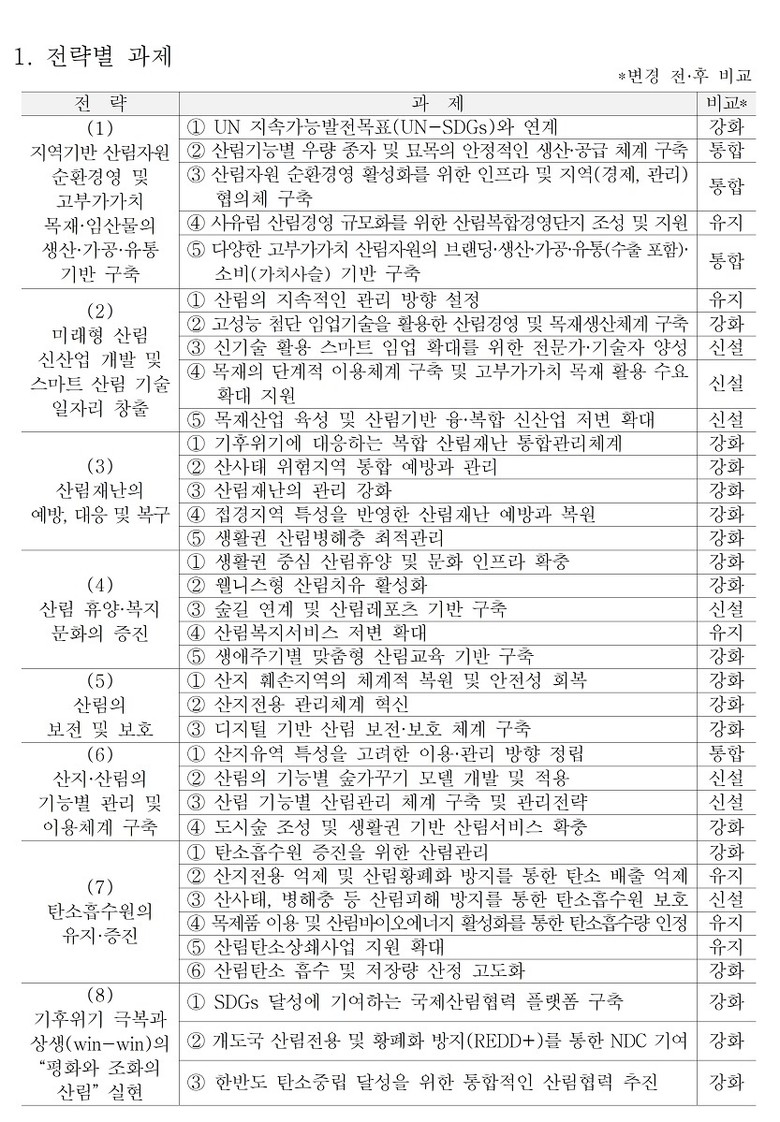 이번 변경계획은 산림경영, 산림재난, 산림문화, 녹지관리, 산림탄소 및 국제(남북)협력 등 6개 분야별 정책의 수요 변화를 반영해 전략과 과제를 전면 재구조화한 것이 특징이다.