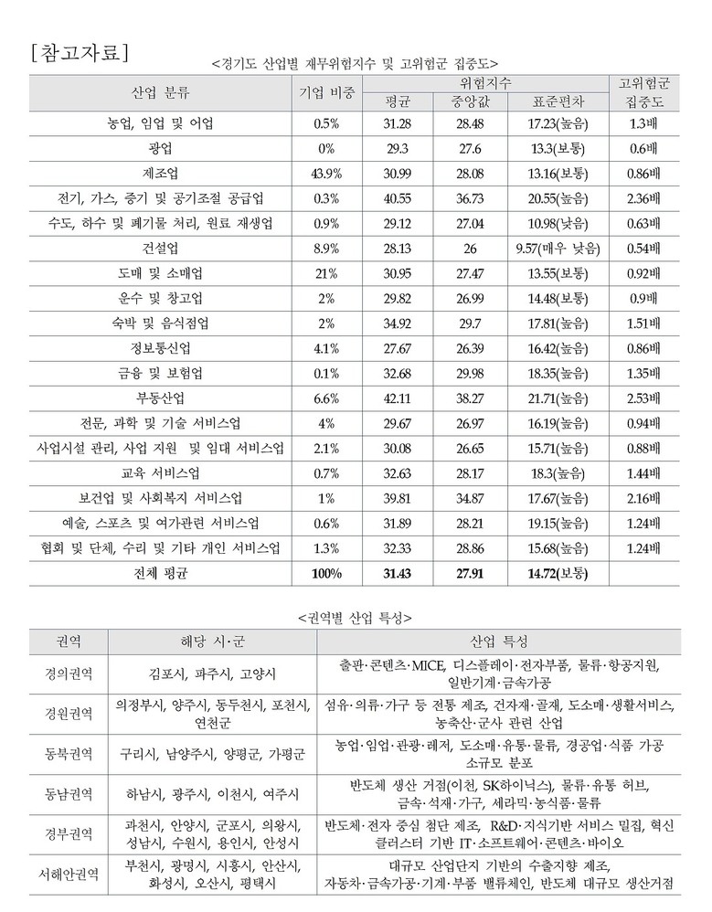 특히 제조업의 경우 평균 위험지수는 도내 평균 수준이지만, 경기도 산업구조에서 차지하는 절대적 규모가 크고 고위험 기업의 37.8%가 집중되어 있어, 개별 기업의 부실이 지역 경제 전반으로 확산되지 않도록 관리가 필요한 것으로 분석됐다.
