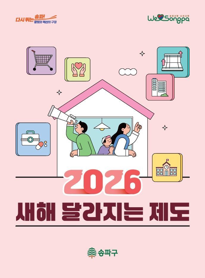- 5대 분야 34개 사업 본격 시행… 풍납도서관, 서울형 키즈카페, 장난감도서관 개관 등 인프라 확충 [송파구 세계타임즈=이장성 기자] 서울 송파구(구청장 서강석)가 2026년을 맞아 구민 생활과 직결되는 각종 제도를 개선하고, 구민 삶의 질을 높이기 위한 ‘2026년 달라지는 제도’를 26일 발표했다.