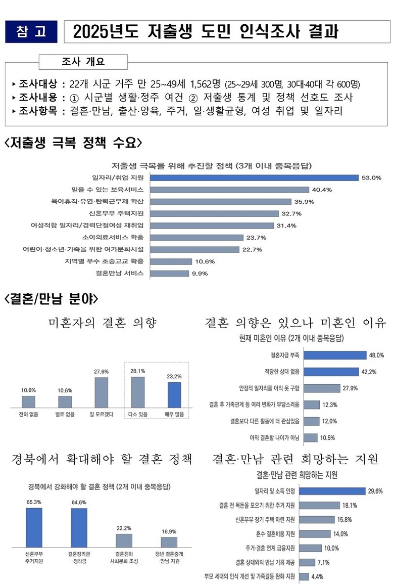 경북도는 만남에서 출산, 돌봄에 이르기까지 생애 전 주기를 아우르는 정책을 추진하며, 2024년 저출생 극복 100대 과제, 2025년 150대 과제를 통해 빈틈없는 정책 체계를 구축해 왔다. 아울러 정책 성과를 체계적으로 분석하기 위한 저출생 정책평가센터를 2025년 3월 지자체 최초로 개소했다.