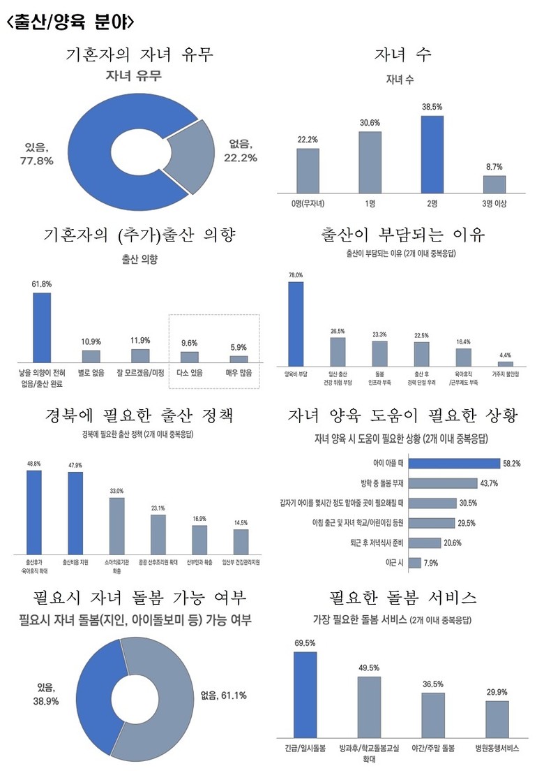 또한 소속 직장에서의 일‧가정 병행의 적합 정도가 63%정도로 높았음에도 경북에 가장 필요한 출산 정책으로 출산‧육아휴직 확대가 꼽힌 것은 제도가 현장에서 체감되기 어렵다는 점을 시사하는 것으로 해석된다.