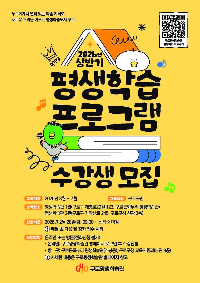 구로구 관계자는 “상반기 평생학습 프로그램은 구민 각자의 삶에 맞는 배움을 선택할 수 있도록 폭넓게 준비했다”며 “배움을 통해 새로운 가능성을 발견하는 시간이 되길 바란다”고 말했다.