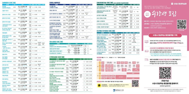 자세한 내용은 수원시 평생학습 통합플랫폼(swlearn.gseek.kr)에서 확인할 수 있다.