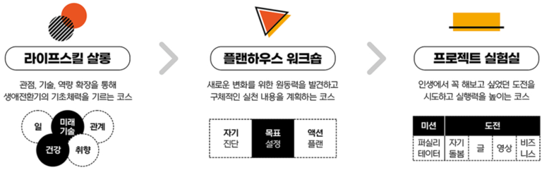 교육과정은 ▴라이프스킬 살롱(탐색과 확장) ▴플랜하우스 워크숍(계획 구체화) ▴프로젝트 실험실(실행과 변화) 등 3단계로 운영되며, 4월 11일(토) 입학식을 시작으로 12월 성과공유회까지 약 8개월간 진행된다.